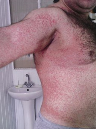 Як правило, з 5 доби виникають висипання. Плямки і прищики червоного кольору. Висип виникає згори до низу! Спочатку обличчя, голова, шия, руки, тулуб, ноги.
