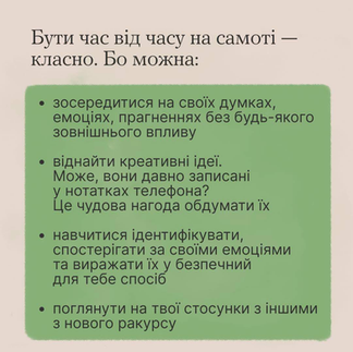 Гортай, щоб спробувати чи знову полюбити бути зі собою. Та переходь на сайт, щоб прочитати більше фактів і порад для проведення часу наодинці. Платформа «Ти як?» має цілий матеріал, лінк на нього є в профілі.