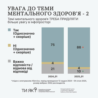 Cпівчуття замість критики ментальних проблем. Бажання поступово «відкриватися» фахівцям та конструктивні методи подолання стресу. Про це — результати четвертої хвилі всеукраїнського дослідження, проведеної у грудні 2024-січні 2025 року в межах Всеукраїнської програми ментального здоров’я «Ти як?».